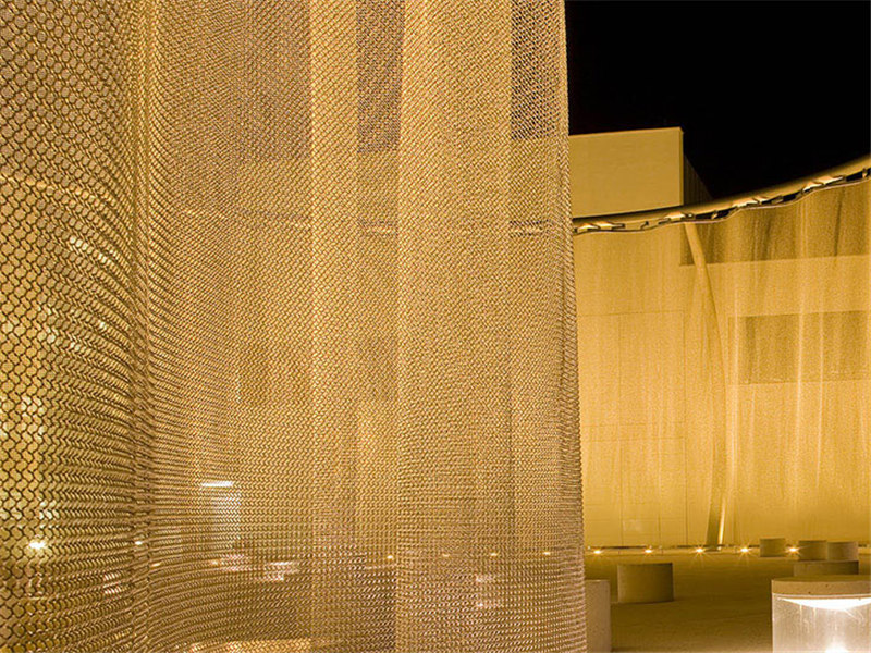 金属网帘由金属丝经螺旋编织而成,表面经特殊工艺处理可以按照客户要求做成古铜色,金色等等各种颜色,配合幕帘轨道可以像窗帘一样左右拉伸,产品广泛用于窗帘,隔断,吊顶,墙面装饰等,配合射灯使用,可以给室内带来金碧辉煌的效果,是酒店,展厅等理想的装饰材料。金属网帘的高度,宽度可以根据用户要求定做,公司备有色卡供用户选择颜色。
